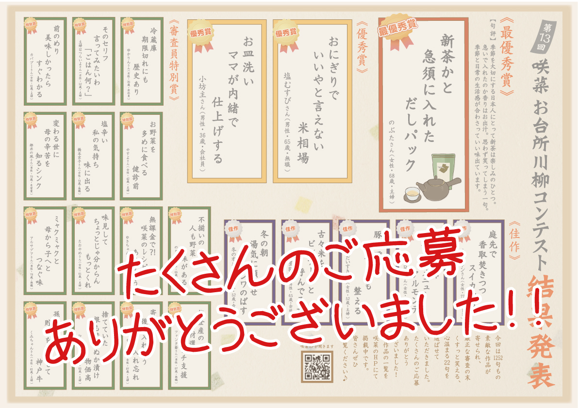 2025年9月1日 更新情報 「第13回お台所川柳コンテスト」 今月から10/31(金)まで 開催します! お台所にまつわる素敵な作品を お待ちしています♪